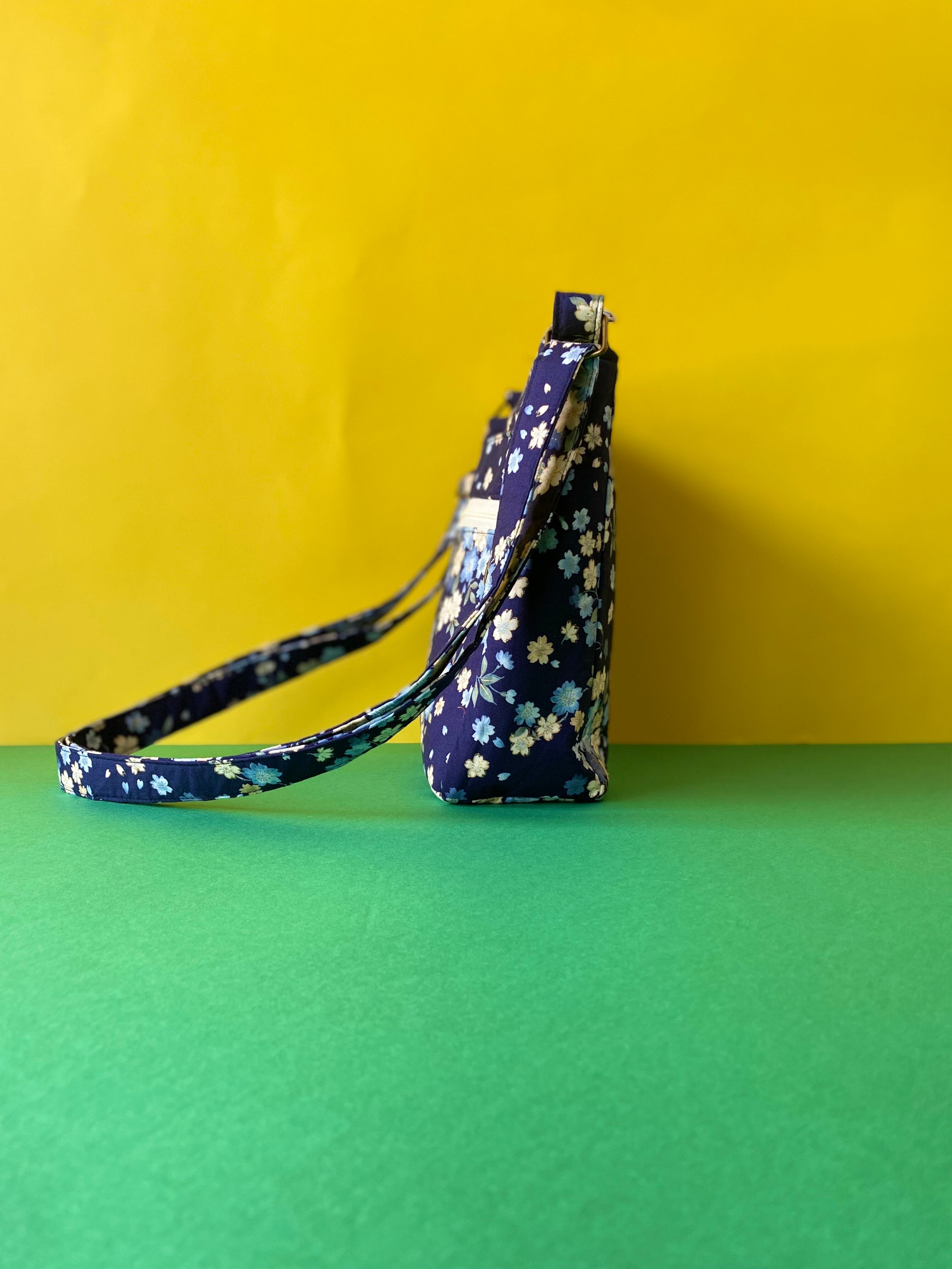 静かに咲く、小さな青い花々を散りばめたショルダーバッグ。