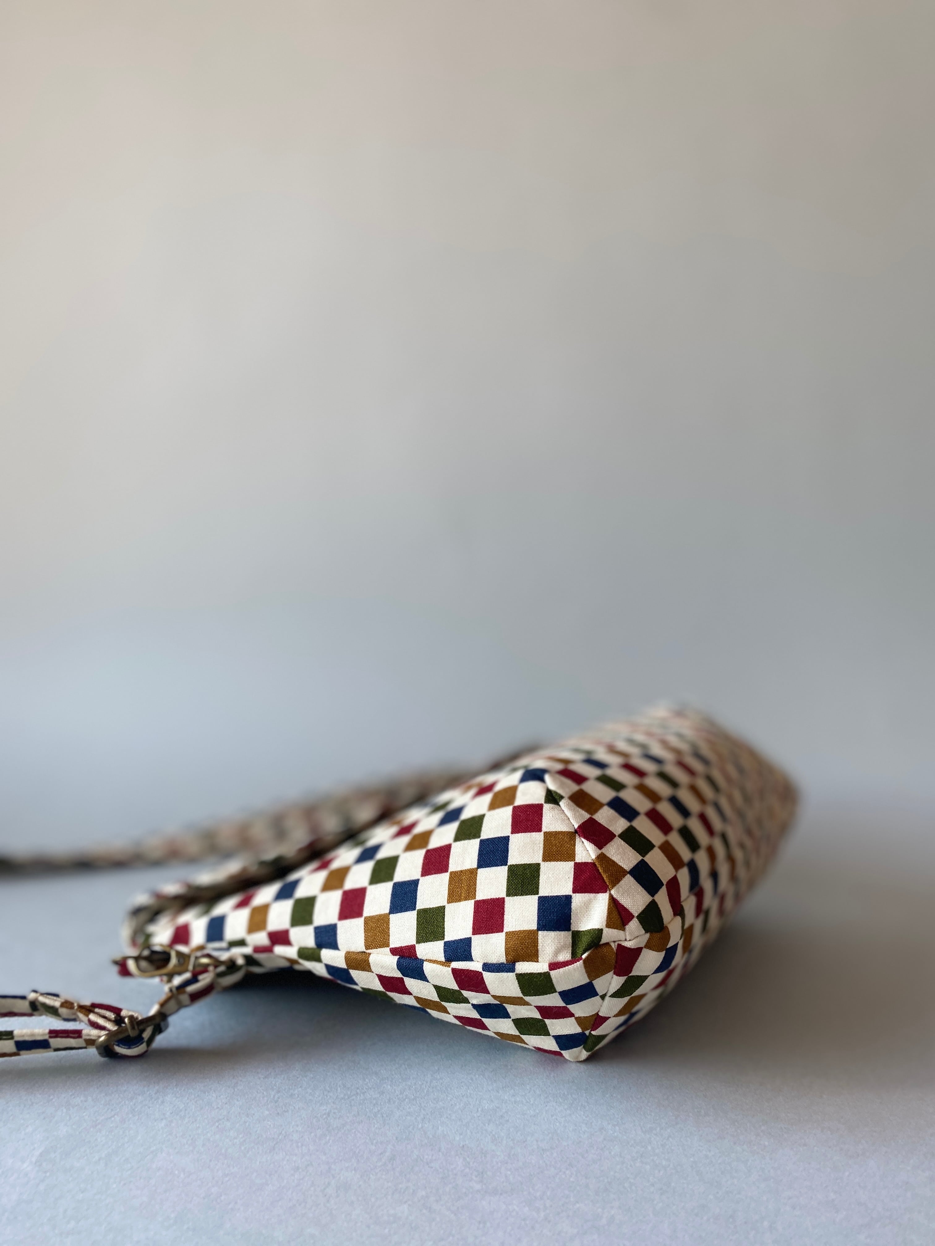 The “Japanese Checkered Shoulder Bag” is a handmade bag characterized by a checkered design that evokes a traditional Japanese aesthetic. Small squares in calm tones of red, blue, green, and brown are neatly arranged, creating a simple yet warm impression. Despite its compact size, this bag offers practical storage for daily essentials, with a flap closure to securely protect your belongings. The adjustable strap allows for customizable shoulder styling, making it versatile for various looks. It pairs effortlessly with casual outfits and is also a perfect match for Japanese-style clothing. Enjoy the warmth of handmade craftsmanship with this special, unique bag.