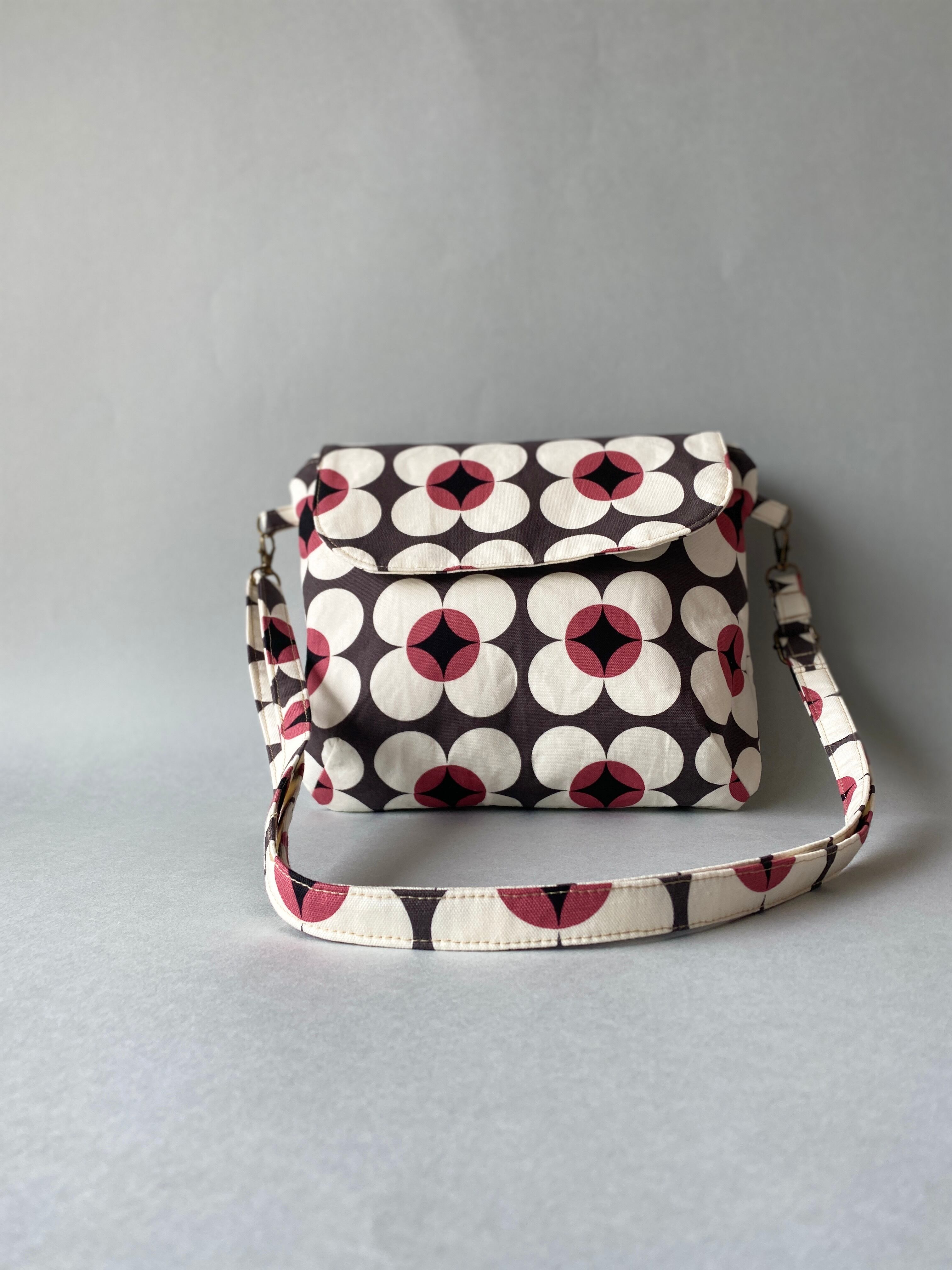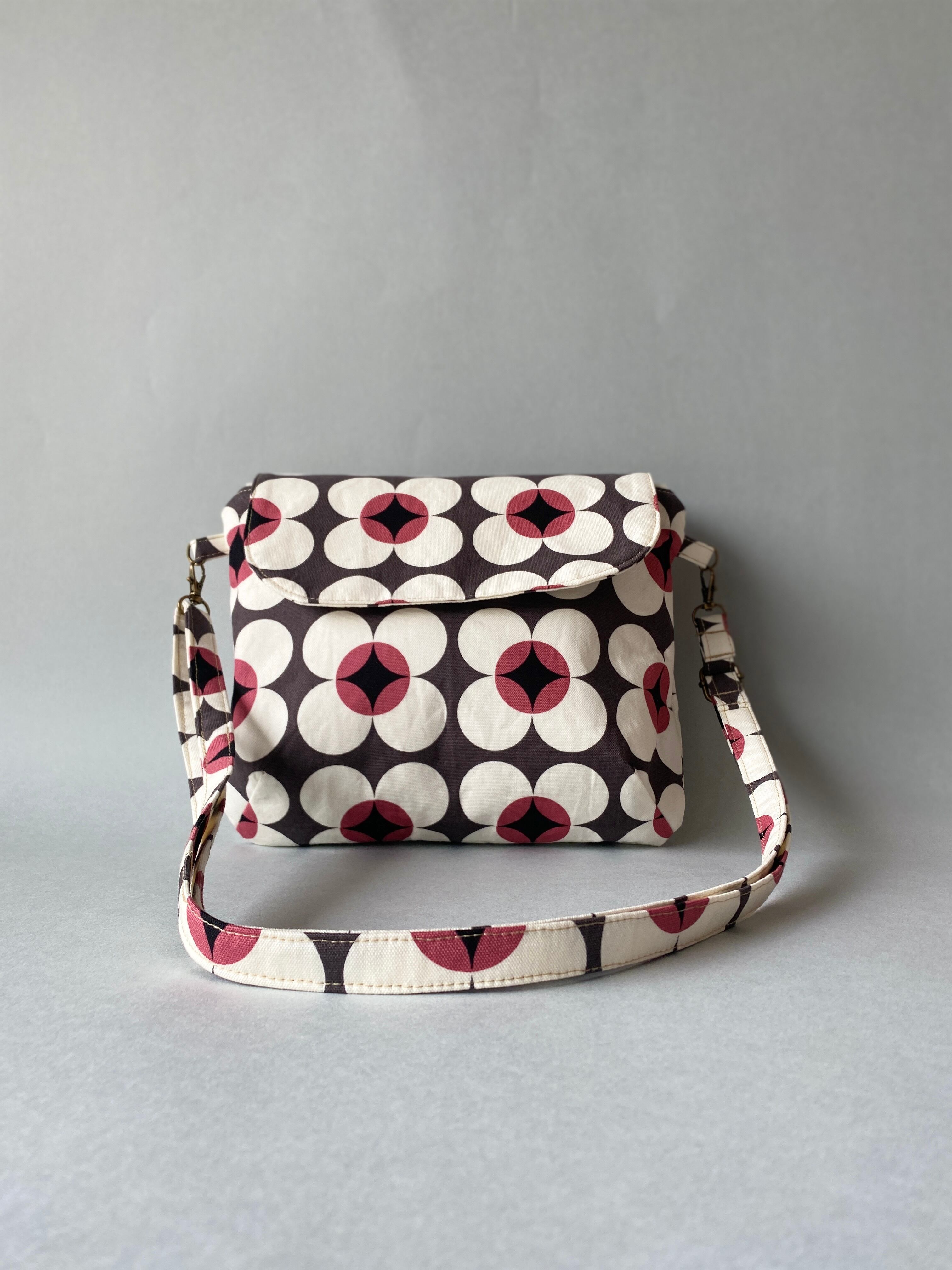白と深みのあるバーガンディのコントラストが美しい円形パターンが、バッグ全体に遊び心とモダンな印象をプラス。コンパクトながら存在感のあるデザインで、カジュアルな装いにも、きちんと感のあるコーディネートにもマッチします。
