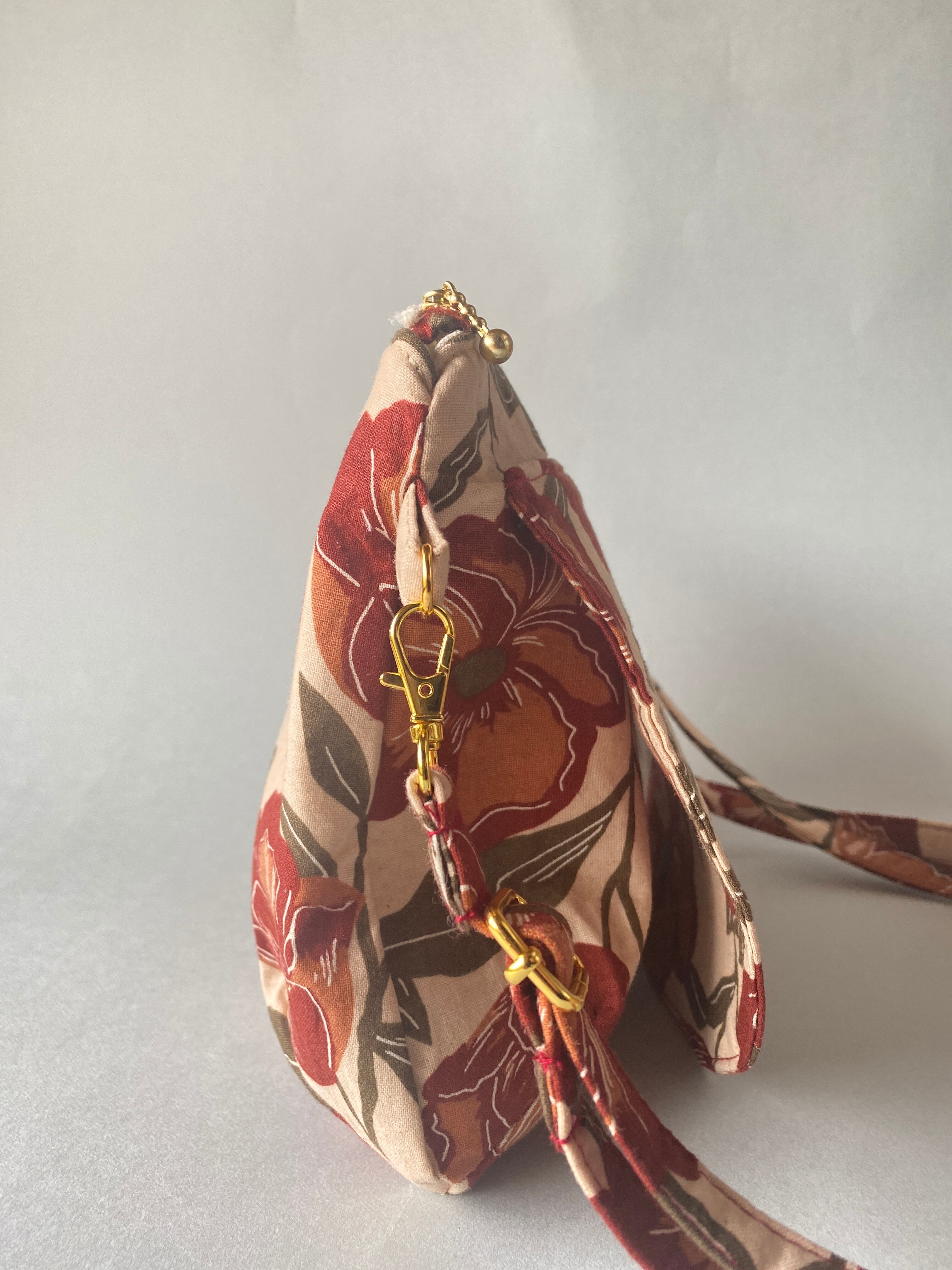 • デザイン:クリーム色のベースに、赤とオレンジの花々が大胆に描かれたパターンが、バッグ全体に温もりと華やかさをプラス。コンパクトながらも印象的なデザインで、カジュアルな装いにも、フェミニンなコーディネートにも自然に馴染みます。