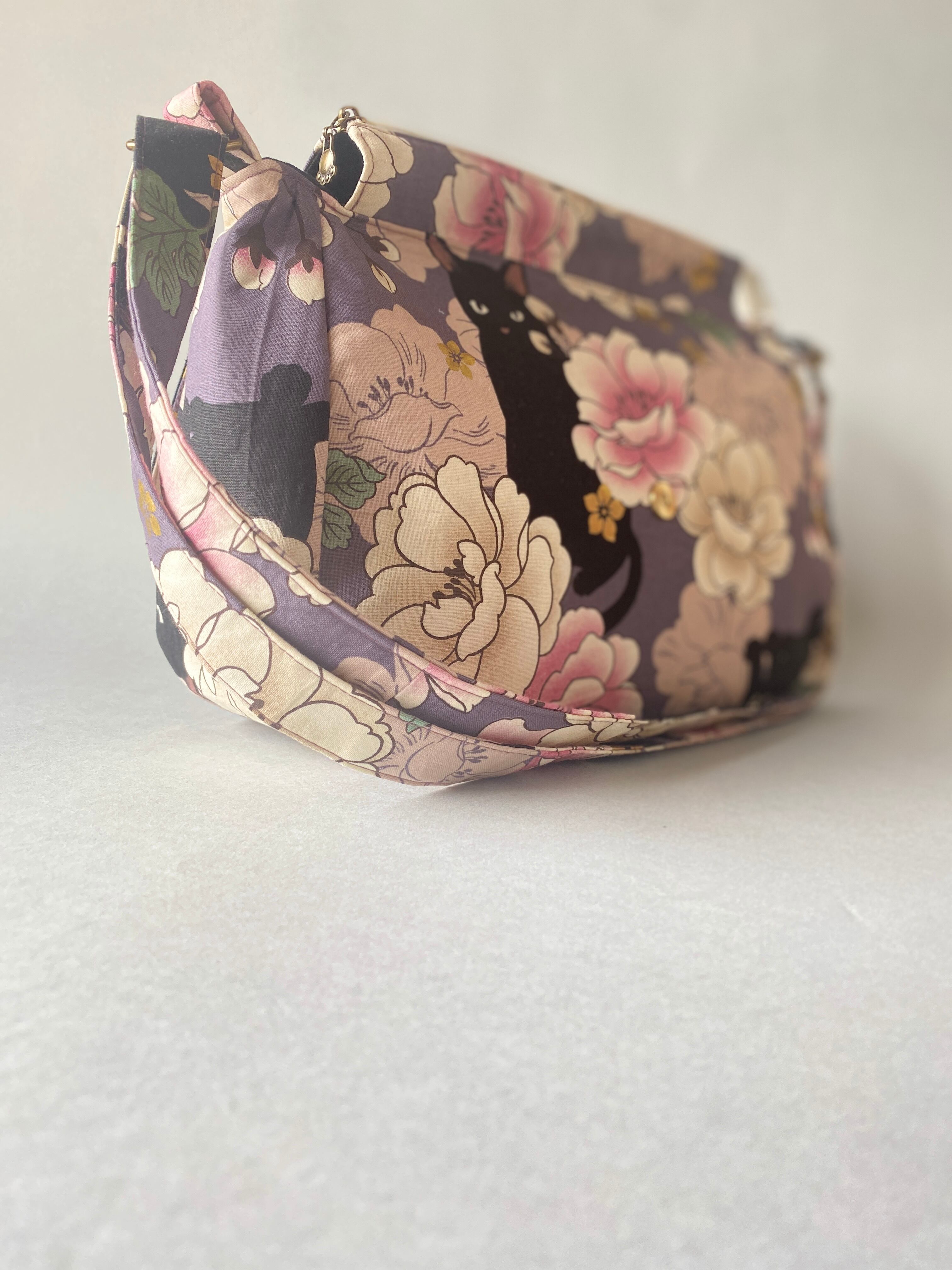 • デザイン:紫がかったグレーのベースに、白とピンクの花々が優雅に咲き、その間を黒猫がそっと歩くパターンが、バッグ全体に穏やかな魅力をプラス。コンパクトながらも印象的なデザインで、カジュアルな装いにも、上品なコーディネートにも自然に馴染みます。